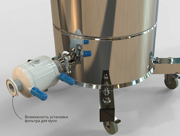 В емкости можно одновременно проводить грубую и тонкую фильтрацию. Грубую с помощью сита, установленного внутрь емкости, для отделения мезги или крупных взвесей, а тонкую - с помощью фильтра для удаления опалесценции.