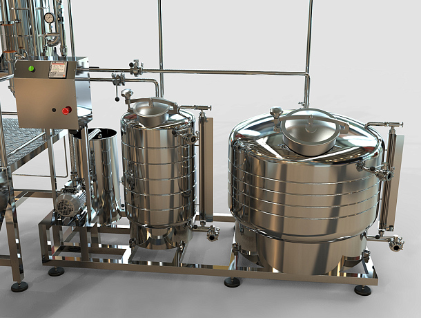 - Приемные емкости 150 л и 450 л присоединены к установке и позволяют собирать готовый продукт, не нарушая герметичность, необходимую для нормальной работы вакуума.