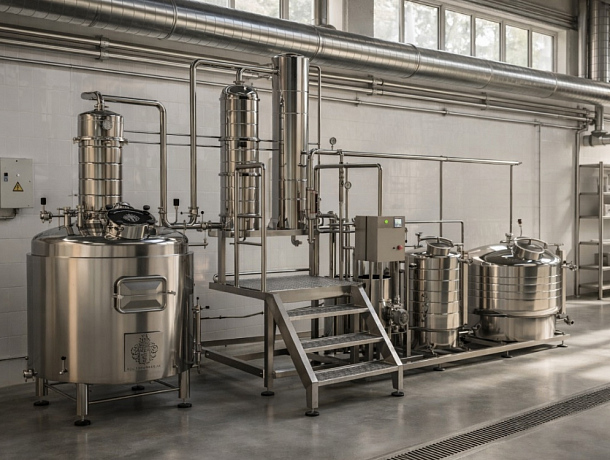 Вакуум-выпарная установка объёмом 500 литров — профессиональное решение для деликатной переработки ароматного сырья в условиях пониженного давления. Оборудование предназначено для получения насыщенных ароматных спиртов и концентрированных соков с сохранением естественного вкуса, аромата и летучих компонентов.